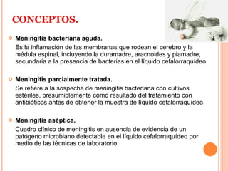 La meningitis bacteriana aguda es la inflamación de las membranas que rodean el cerebro y la médula espinal causada por bacterias en el líquido cefalorraquídeo. Los agentes más comunes son Haemophilus influenzae, Streptococcus pneumoniae y Neisseria meningitidis. El diagnóstico se realiza mediante punción lumbar y análisis del líquido cefalorraquídeo. El tratamiento consiste en antibióticos empíricos iniciales como vancomicina y cefotaxima, seguidos por antib