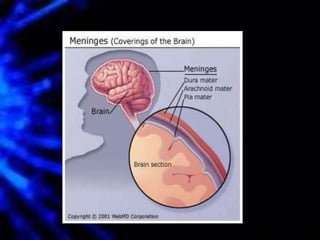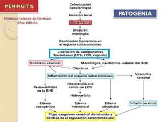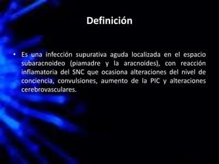 La meningitis bacteriana es una infección del espacio subaracnoideo que causa inflamación del SNC. Los principales agentes etiológicos son Haemophilus influenzae, Neisseria meningitidis y Streptococcus pneumoniae. El diagnóstico se basa en el examen clínico, análisis del LCR y pruebas de laboratorio. El tratamiento consiste en antibióticos empíricos seguidos de antibióticos dirigidos una vez conocido el germen causal.