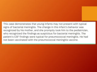 Este documento trata sobre la meningitis bacteriana. Discuten factores de riesgo para diferentes patógenos, cuadros clínicos, hallazgos de laboratorio en el líquido cefalorraquídeo, tratamiento empírico y específico para diferentes bacterias, así como el uso de esteroides como terapia adyuvante. En resumen, cubre la etiología, diagnóstico y manejo de la meningitis bacteriana.