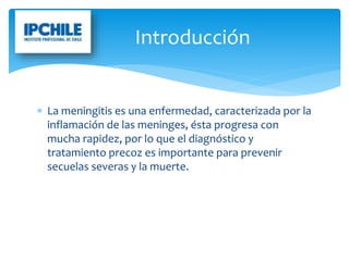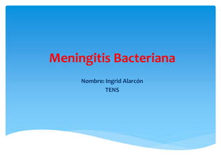 La meningitis bacteriana es una enfermedad caracterizada por la inflamación de las meninges que recubren el cerebro y la médula espinal, causada por la bacteria Neisseria meningitidis. Se transmite de persona a persona a través de gotas de saliva. Los síntomas se desarrollan rápidamente, por lo que el diagnóstico y tratamiento tempranos son importantes. La meningitis bacteriana puede ser grave y causar secuelas o incluso la muerte, pero afortunadamente es poco frecuente.