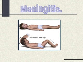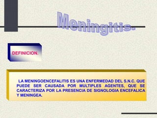 La meningoencefalitis es una enfermedad del sistema nervioso central que puede ser causada por múltiples agentes, caracterizada por la presencia de signos meníngeos y encefálicos. Puede deberse a bacterias como E. coli, Neisseria meningitidis o virus como el virus del herpes. Los síntomas incluyen fiebre, rigidez de nuca, alteración del estado de conciencia y convulsiones. El diagnóstico se realiza mediante el análisis del líquido cefalorraquídeo y el tratamiento de