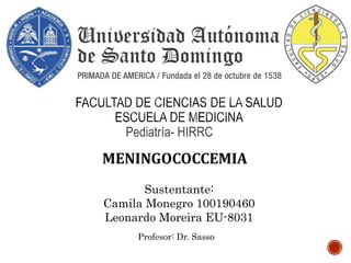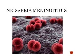 La meningitis meningocócica es una infección bacteriana grave causada por Neisseria meningitidis que afecta las membranas que rodean el cerebro y la médula espinal. Puede presentarse como meningitis, septicemia o ambas. La vacunación es importante para prevenirla, especialmente en África subsahariana donde es endémica. El tratamiento incluye antibióticos como cefotaxima o ceftriaxona.
