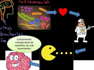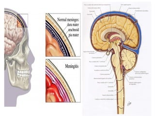 Este documento describe la meningoencefalitis, una inflamación del cerebro y las meninges que cubren el cerebro y la médula espinal. Presenta las principales causas bacterianas y virales, los síntomas que varían según la edad, el diagnóstico a través del examen del líquido cefalorraquídeo, y el tratamiento antimicrobiano empírico de acuerdo a la edad del paciente.