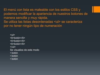 Este documento describe cómo crear un menú de navegación con una lista desordenada y estilos CSS. Explica que las listas desordenadas se utilizan para crear botones de menú sin numeración y cómo agregar enlaces a cada elemento de lista. Luego, detalla cómo aplicar estilos CSS a la lista y sus elementos para modificar la apariencia del menú, incluido el fondo, altura, márgenes y relleno. Finalmente, indica que se creará un estilo compuesto para los enlaces dentro de cada elemento de lista.