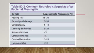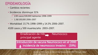 Este documento discute la epidemiología, etiología, mecanismos, diagnóstico y tratamiento de la meningitis bacteriana en niños. Ha habido una disminución reciente en la incidencia y mortalidad debido a la erradicación de Haemophilus influenzae tipo b y la introducción de vacunas contra neumococo. Sin embargo, Streptococcus pneumoniae sigue siendo el principal agente causal. El tratamiento empírico incluye antibióticos con buena penetración en el LCR, y la terapia adjunta con corticoides puede ser benef