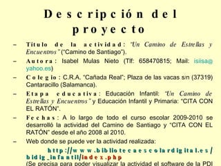 El proyecto 'Un camino de estrellas y encuentros' del C.R.A. 'Cañada Real' busca integrar la tecnología en la educación infantil y primaria mediante el uso de pizarras digitales interactivas y recursos tecnológicos. A través de diversas actividades, se enseña a los alumnos competencias TIC que les permitan familiarizarse con el uso de ordenadores y mejorar su motricidad fina, creatividad y habilidades de lecto-escritura. El esfuerzo colaborativo con el CITA y la formación docente son fundamentales para el éxito del proyecto educativo.