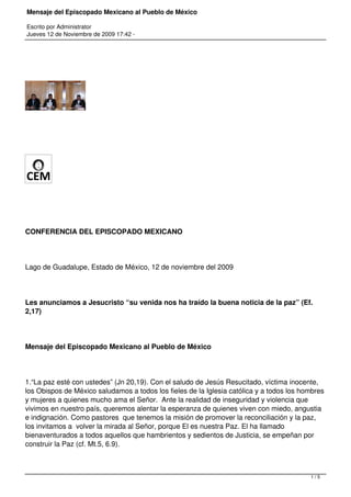 El Episcopado Mexicano emitió un mensaje al pueblo de México sobre la situación de inseguridad y violencia en el país. En el mensaje, los obispos expresan su dolor por las víctimas y llaman a la conversión y renovación espiritual para superar la crisis a través de una educación que promueva la dignidad humana. También hacen un llamado a los gobernantes a perseguir la corrupción e impunidad y a los involucrados en el narcotráfico a detener sus actividades ilegales y dañinas.