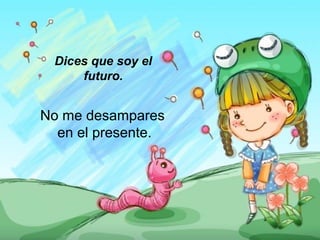 El poema es un mensaje del Niño a los adultos pidiendo guía, comprensión y un buen ejemplo en lugar de abandono, guerra o maldad. El Niño no desea solo diversión o regalos, sino luz, entendimiento, humildad, devoción, perdón y una corrección bondadosa.