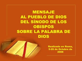 El documento presenta un mensaje del Sínodo de los Obispos sobre la Palabra de Dios. Propone un viaje espiritual en cuatro etapas: 1) La voz de la Palabra a través de la revelación divina en la creación y la historia humana, 2) El rostro de la Palabra en Jesucristo, 3) La casa de la Palabra en la Iglesia, y 4) Los caminos de la Palabra a través de la misión.