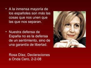 El documento presenta las posiciones de varios políticos y pensadores españoles sobre la situación política en España. Abogan por preservar la unidad del país frente a los nacionalismos y regenerar la democracia reduciendo la influencia de los partidos en el poder judicial. Se funda el nuevo partido Unión Progreso y Democracia con este objetivo.