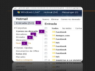 Este documento proporciona instrucciones sobre cómo manejar una cuenta de correo electrónico y enviar mensajes de correo. Explica las diferentes secciones de una cuenta de correo como la bandeja de entrada, el correo no deseado y los borradores. También detalla los pasos para enviar un mensaje de correo, incluyendo agregar destinatarios, asunto, adjuntos y el contenido del mensaje.