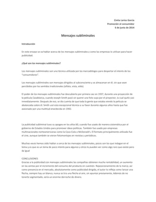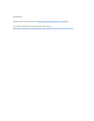 Este documento habla sobre los mensajes subliminales y cómo las empresas los utilizan en la publicidad. Explica que los mensajes subliminales son mensajes dirigidos al subconsciente que no son percibidos conscientemente y que fueron descubiertos en 1937 durante una proyección de cine. En la década de 1960, los mensajes subliminales alcanzaron su apogeo al ser utilizados sistemáticamente por el gobierno de EE. UU. y empresas multinacionales como Coca-Cola y McDonald's para promover ideas políticas y product