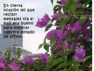 El documento describe cómo recibir mensajes electrónicos de amigos cercanos puede mejorar el estado de ánimo y mantener conexiones significativas a pesar de la distancia. El autor ha recibido mensajes positivos de personas de todo el mundo que lo han apoyado y animado. Aunque no se puede sustituir el contacto físico, estos "amigos virtuales" ocupan un lugar importante en su corazón. Los mensajes afectuosos inesperados pueden ser terapéuticos y ayudar a superar los malos momentos.