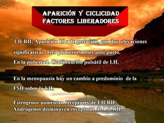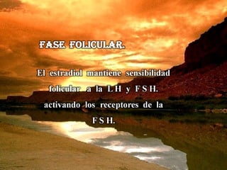 El documento describe las diferentes fases del ciclo menstrual, incluyendo la fase folicular, ovulación, y fase lútea. Explica cómo los niveles de estrógenos y progesterona varían a lo largo del ciclo, alcanzando picos durante la ovulación y la fase lútea. También proporciona valores típicos de hormonas como el estradiol, la estrona y la progesterona durante cada fase del ciclo.
