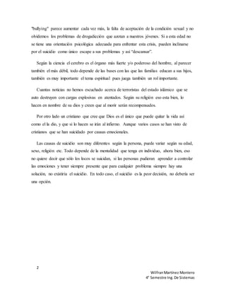 El documento discute el tema de la conducta suicida. Señala que cada año alrededor de 800,000 personas se suicidan en todo el mundo, y que en Colombia en 2015, el suicidio fue la cuarta causa de muerte violenta, especialmente entre los jóvenes de 15 a 34 años. Explica que las causas del suicidio son complejas y variadas, y pueden incluir problemas de autoestima, acoso escolar, drogadicción, y falta de apoyo psicológico para enfrentar crisis emocionales. Concluye que
