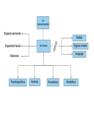 Este documento resume diferentes aspectos de la comunicación no verbal, incluyendo la paralingüística que estudia aspectos no verbales como la posición del cuerpo y los gestos, la kinésica o lenguaje corporal que incluye gestos que expresan significados, la proxémica que se refiere al uso del espacio personal, y la simbólica que proporciona una forma de representar datos de manera uniforme.