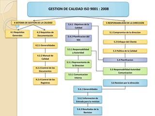 Este documento presenta un resumen de los requisitos del sistema de gestión de calidad ISO 9001:2008. Explica los ocho principales requisitos del estándar, incluida la responsabilidad de la dirección, la gestión de recursos, la realización del producto y la medición, análisis y mejora. También describe gráficamente cómo interactúan estos requisitos como parte de un sistema de gestión de calidad integral diseñado para satisfacer las necesidades de los clientes y partes interesadas.