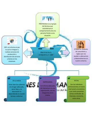 Este documento presenta información sobre el servicio al cliente, protocolo, etiqueta y ERP. Define protocolo como un conjunto de técnicas que estandarizan el comportamiento, etiqueta como reglas que nos ayudan a desenvolvernos en nuestro entorno, y ERP como la forma de integrar procesos de producción y distribución en empresas. Además, ofrece detalles sobre etiqueta en la mesa, empresarial y social.