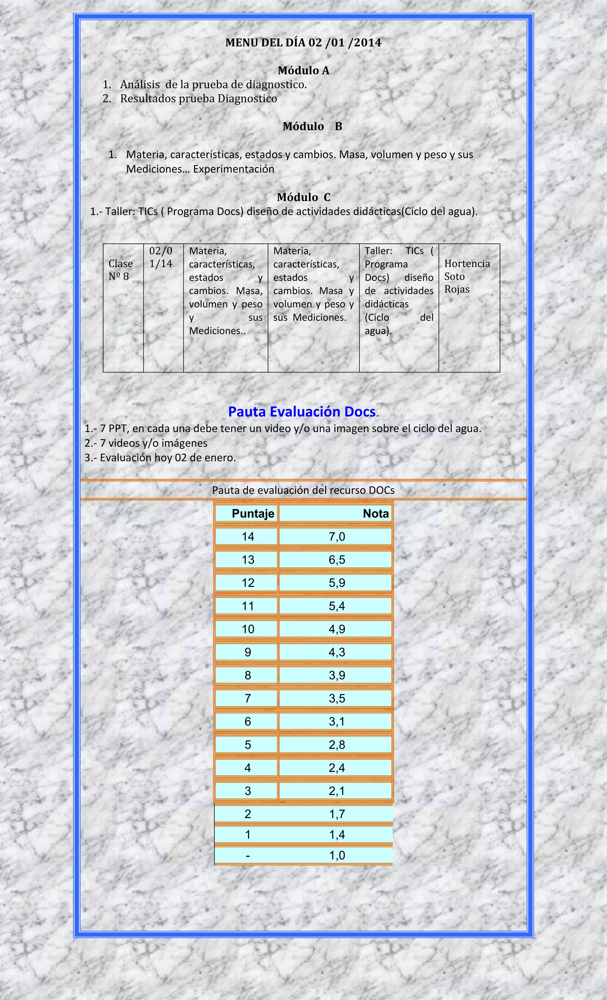 El documento presenta el menú del día 02/01/2014 con tres módulos de estudio. El Módulo A incluye el análisis de una prueba diagnóstica y sus resultados. El Módulo B cubre materia, características, estados y cambios, masa, volumen y peso y sus mediciones a través de experimentación. El Módulo C consiste en un taller sobre TICs para diseñar actividades didácticas sobre el ciclo del agua usando el programa Docs.
