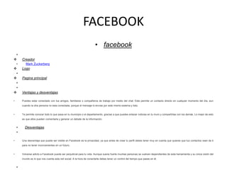 Este documento describe varias redes sociales como Facebook, Sonico, WhatsApp e Instagram. Proporciona información sobre sus creadores, logos, páginas principales, ventajas y desventajas. Entre las ventajas se mencionan la capacidad de comunicarse con otros y conocer noticias locales. Las desventajas incluyen problemas de privacidad, adicción y falta de verificación de identidad. Cada plataforma requiere un proceso de registro que solicita nombre, datos personales y correo electrónico.