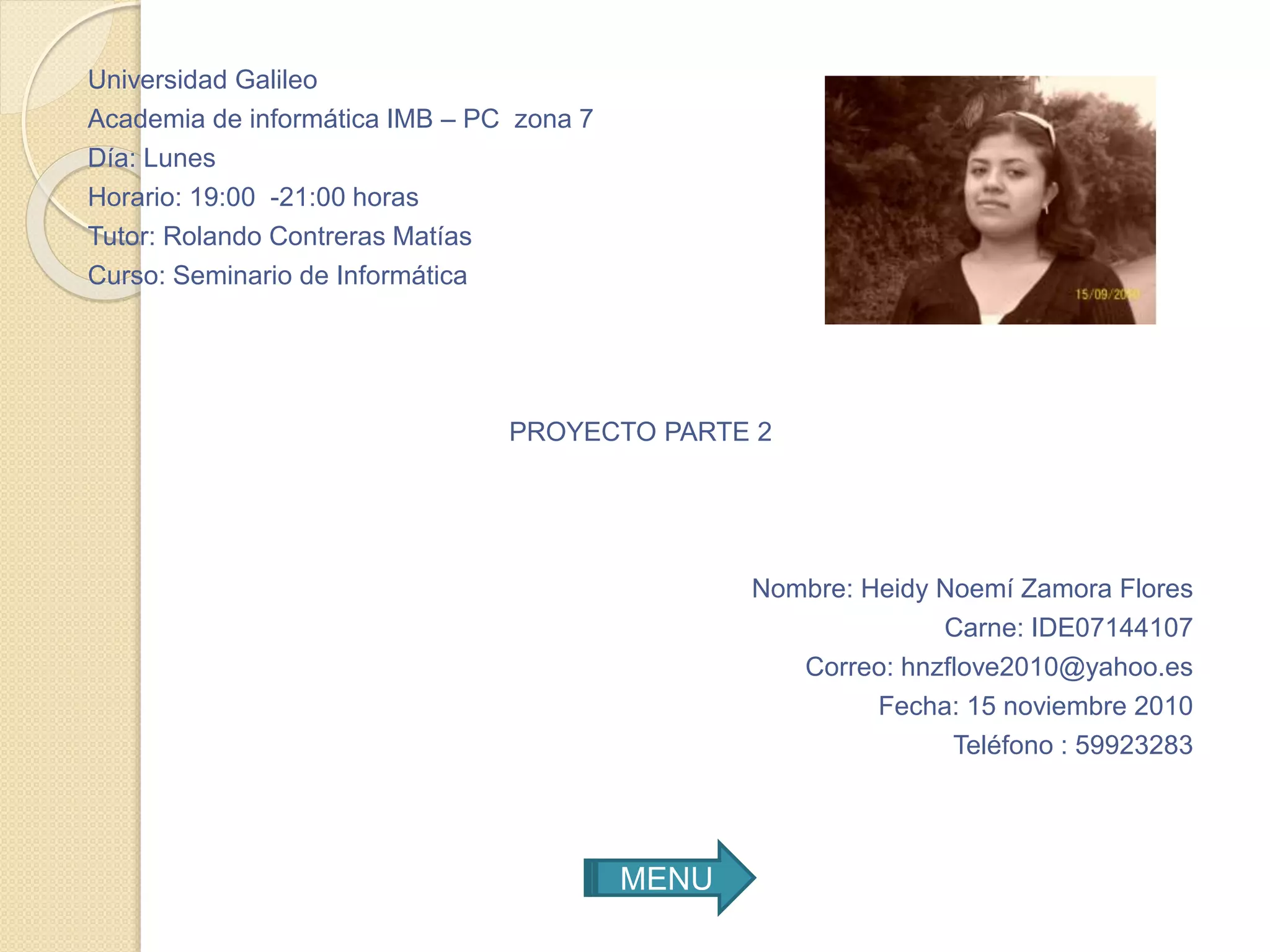 Este documento presenta un menú de contenidos para un curso de informática. El menú incluye secciones como introducción, utilidad del tema, publicación de páginas web, archivos en PowerPoint, blogs personales y conclusiones. El documento proporciona información sobre cómo crear presentaciones profesionales en PowerPoint y publicar contenido en línea utilizando herramientas como páginas web y blogs.
