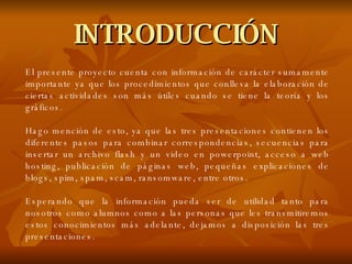 Este documento presenta tres presentaciones sobre temas de informática como combinar correspondencias en PowerPoint, insertar archivos flash y video en PowerPoint, acceso a hosting web, publicación de páginas web, blogs, spam, ransomware y más. El objetivo es proveer conocimientos útiles para los estudiantes y personas a las que se les transmitirá esta información. Se explica la importancia de actualizarse constantemente en temas informáticos para facilitar el desempeño laboral y resolver complicaciones tecnológicas. Finalmente, se incluye una bibliografía con enl