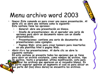 Este documento resume los principales comandos de archivo en Microsoft Word 2003, incluyendo Nuevo, Abrir, Cerrar, Guardar y Guardar como. Nuevo permite crear una nueva presentación en blanco o con un diseño preestablecido. Abrir muestra archivos existentes que pueden seleccionarse para su apertura. Cerrar cierra el documento activo opcionalmente guardándolo. Guardar y Guardar como permiten almacenar el archivo en una ubicación y formato específicos.