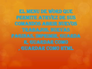 El documento describe el menú Archivo en Word, el cual permite abrir nuevos documentos, guardar el trabajo actual para evitar pérdidas, y enviar el documento a otros destinos a través de comandos como Nuevo, Abrir, Guardar, Guardar como HTML, Imprimir y Enviar. El menú Archivo ofrece opciones para gestionar y compartir el contenido creado en Word.
