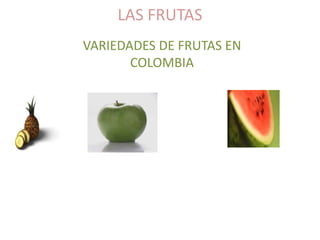 Este documento presenta información sobre las frutas en Colombia, incluyendo los tipos más vendidos como el banano y la manzana, y sugiere formas de incluir frutas en los menús dependiendo del gusto personal y la ubicación, teniendo en cuenta la calidad de las frutas para obtener un mejor sabor.