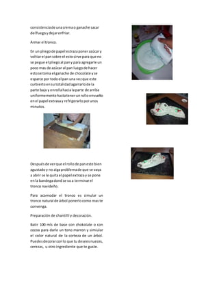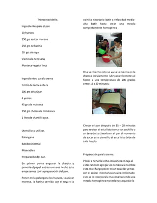 El documento proporciona instrucciones detalladas para preparar varios postres navideños tradicionales mexicanos, incluidos tronco navideño, cheesecake de naranja, fruit cake, karlota navideña, trufas de chocolate, gelatina cristal y de leche. Las recetas incluyen listas de ingredientes y pasos para hacer cada postre.