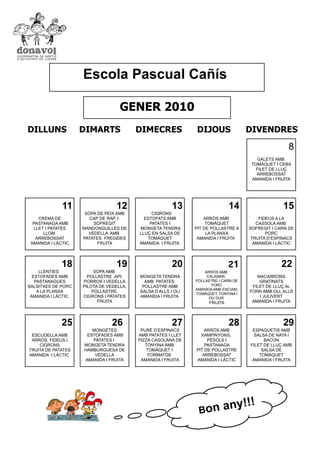 El documento presenta el menú semanal de una escuela para la semana del 11 al 29 de enero. El menú incluye opciones como sopa de pescado, cigrones estofados, arroz con tomate, fideos a la cassola, macarrones gratinados y filete de lubina al horno. Las comidas suelen incluir una opción principal, acompañamientos como patatas fritas o ensalada, y fruta.