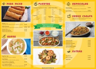 Este documento es el menú de un restaurante de comida china llamado Orient Express. Ofrece una variedad de bebidas, platos calientes y fríos incluyendo sopas, fideos, arroz frito y platos apanados a partir de $1. Aceptan pedidos a partir de $12 e incluyen IVA en los precios.