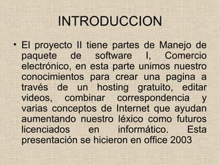 Este documento presenta un proyecto sobre el uso de PowerPoint que incluye subir una presentación a Internet, usar Movie Maker, combinar correspondencia, crear un blog, y presentar un flash. Explica los pasos para publicar una página web, mostrar videos y archivos, y combinar correspondencia de Word con otros programas. También define conceptos informáticos como blogs, ransomware y malware, e incluye consejos como mantener antivirus actualizados y no usar mucho contenido en diapositivas.
