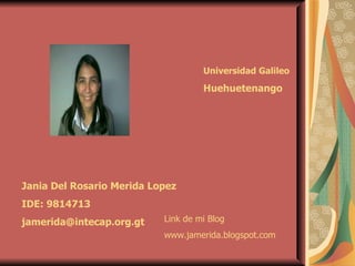 Este documento presenta el currículum vitae de Jania Del Rosario Merida Lopez. Detalla su información personal, educación, premios, experiencia laboral y habilidades. Ha asistido a varias escuelas primarias y secundarias en Huehuetenango y obtuvo un título de secretaria bilingüe. También completó estudios universitarios en administración de empresas. Tiene experiencia trabajando como secretaria en varias instituciones bancarias como MultiBanco y Bancafe. Domina programas de Microsoft Office y herramientas de presentaciones