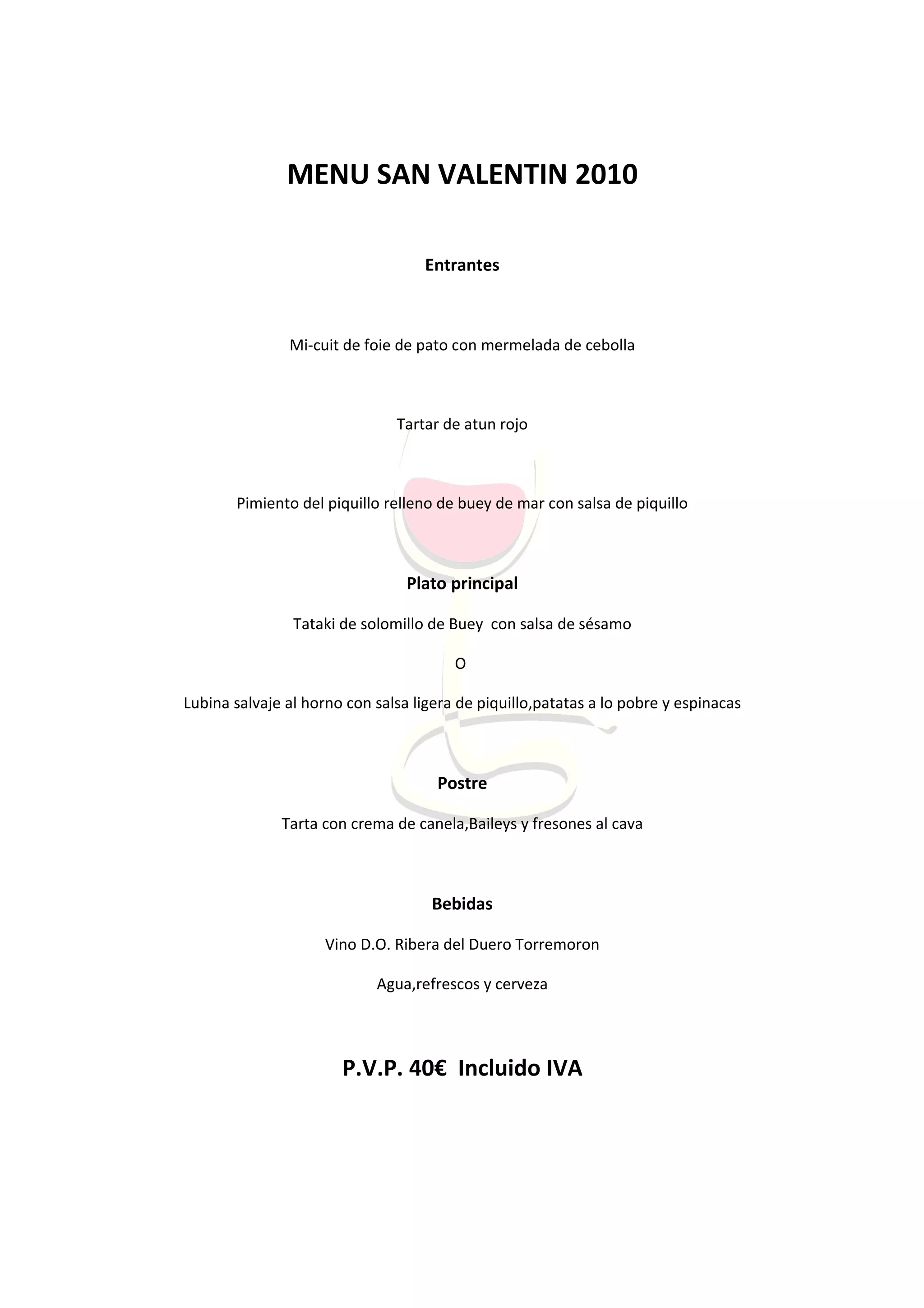 El menú de San Valentín incluye entrantes como mi-cuit de foie de pato con mermelada de cebolla y tartar de atún rojo. Los platos principales son tataki de solomillo de buey con salsa de sésamo u lubina salvaje al horno con salsa de piquillo, patatas y espinacas. El postre es una tarta de crema de canela, Baileys y fresones al cava. Las bebidas incluyen vino Ribera del Duero, agua, refrescos y cerveza.