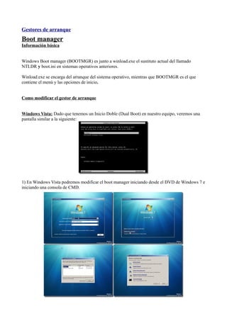 Windows Boot Manager (BOOTMGR) y winload.exe gestionan el arranque de Windows, mientras que NTLDR lo hacía en versiones anteriores. LILO y GRUB son gestores de arranque para sistemas Linux que permiten seleccionar entre sistemas operativos en el inicio. Estos gestores se configuran mediante archivos como lilo.conf o boot.ini para establecer la selección predeterminada y otras opciones.