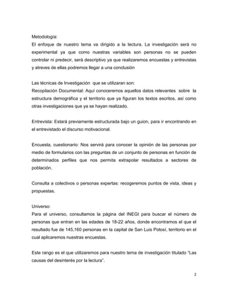 Este documento presenta la metodología de una investigación sobre las causas del desinterés por la lectura entre personas de 18 a 22 años en San Luis Potosí, México. Se utilizarán encuestas y entrevistas como técnicas de investigación. Se encuestarán 399 personas y se entrevistarán a dos coordinadores de grupos de lectura. Las encuestas se aplicarán del 26 de marzo al 14 de abril en diversos lugares públicos.