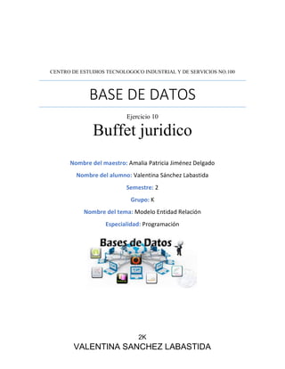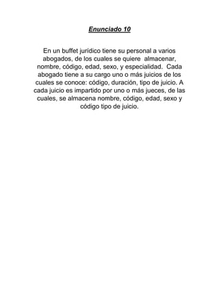 El documento describe un buffet jurídico que almacena información sobre abogados, juicios e jueces. Se almacenan datos como el nombre, código, edad y sexo de los abogados, así como su especialidad. Los juicios tienen un código, duración y tipo, y cada uno es impartido por uno o más jueces cuya información como nombre, código, edad y sexo también se almacena.