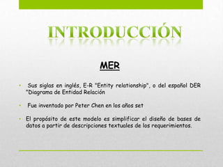 El modelo entidad-relación (MER) fue inventado por Peter Chen en los años 1970 y permite representar las entidades y relaciones relevantes de un sistema de información a través de diagramas. El MER describe entidades mediante atributos y claves, y las relaciones entre entidades pueden ser de uno a uno, uno a muchos o muchos a muchos. Este modelo simplifica el diseño de bases de datos al modelar los requisitos de forma gráfica.