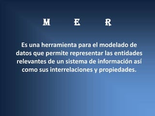 El modelo entidad-relación (MER) permite representar las entidades y relaciones relevantes de un sistema de información. Consiste en elaborar diagramas que muestran las entidades, atributos, relaciones y restricciones. Se utilizan técnicas adicionales como la normalización para lograr un modelo implementable en una base de datos.