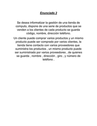 El documento describe un ejercicio para modelar una tienda de computadoras usando un modelo de entidad relación. La tienda vende varios productos a clientes, guardando información como código, nombre y contacto para cada producto y cliente. Un cliente puede comprar múltiples productos y un producto puede ser comprado por múltiples clientes. La tienda también se abastece de productos de varios proveedores, donde un producto puede ser provisto por proveedores múltiples y se almacena información como nombre, dirección, giro y número de teléfono de cada