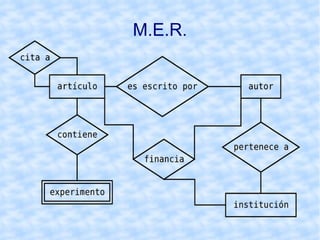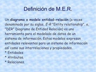 Un diagrama entidad-relación (DER) es una herramienta para modelar datos de un sistema de información. Expresa entidades, atributos y relaciones entre entidades. Las entidades representan objetos reales o abstractos sobre los cuales se guardará información, mientras que las relaciones representan asociaciones entre entidades. El DER proporciona una representación gráfica de estas entidades, atributos y relaciones.