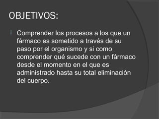 Este documento describe los procesos de farmacocinética que un fármaco experimenta en el cuerpo desde su administración hasta su eliminación. Explica que un fármaco debe absorberse, distribuirse a los tejidos, unirse a proteínas en la sangre, atravesar membranas celulares, y finalmente metabolizarse y eliminarse del cuerpo. Los factores como el tamaño molecular, liposolubilidad e ionización de un fármaco afectan cómo experimenta estos procesos farmacocinéticos.