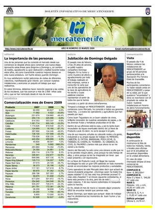 Este boletín informativo de Mercatenerife contiene noticias sobre la jubilación de un empleado de larga data, Domingo Delgado, visitas recientes al mercado de parte de grupos escolares y asociaciones, y estadísticas sobre la comercialización de productos en enero de 2009 con comparaciones a años anteriores. También incluye anuncios sobre cursos de formación, exposiciones de vehículos y precios de productos.