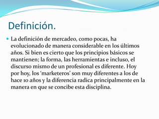 Este documento presenta una definición general de mercadeo y sus principales componentes. Explica que el mercadeo incluye analizar las necesidades del mercado, desarrollar un producto adecuado, establecer un precio, seleccionar un segmento de mercado, y comunicar el mensaje. Luego describe cada una de las 4P del mercadeo (producto, precio, plaza y promoción) y el proceso general de mercadeo, incluyendo el análisis del mercado objetivo.