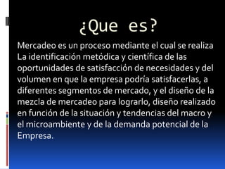 Este documento define el mercadeo como un proceso mediante el cual una empresa identifica oportunidades para satisfacer necesidades de diferentes segmentos de mercado y diseña una mezcla de mercadeo para lograrlo. Explica que el mercadeo incluye el producto, precio, canales de distribución y promoción. También señala que a medida que una empresa crece, se separan las responsabilidades de mercadeo y ventas. Finalmente, resume los requisitos principales para un gerente de mercadeo como conocimiento de los elementos de mercadeo e investigación de