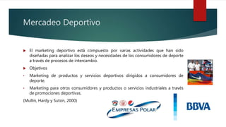 Este documento describe los conceptos clave del mercadeo deportivo. Explica que el mercadeo deportivo involucra actividades diseñadas para analizar las necesidades de los consumidores de deportes a través del intercambio. Luego describe los diferentes tipos de mercadeo deportivo como el mercadeo de eventos deportivos, deportes en general, productos deportivos y entidades deportivas. Finalmente, discute factores como el precio, la promoción y la segmentación del mercado en el contexto del mercadeo deportivo.