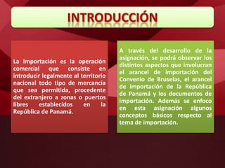 Este documento trata sobre conceptos básicos de importación como el arancel de importación del Convenio de Bruselas, el arancel de importación de Panamá y los cálculos arancelarios. Explica que el arancel de Bruselas fue adoptado en 1913 y ha evolucionado a través de los años, mientras que el arancel panameño actual consta de 21 secciones que detallan productos específicos y sus respectivos aranceles. También cubre el cálculo del arancel aplicando el porcentaje al valor CIF de los bienes importados y añadiendo impuest