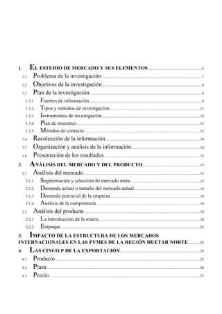 Este documento presenta una introducción al estudio de mercados internacionales y sus elementos. Explica que un estudio de mercado sistemático permite entender las necesidades de los consumidores y tomar mejores decisiones estratégicas. Luego, detalla los pasos clave de un estudio de mercado, incluyendo definir el problema e objetivos de investigación, planificar fuentes de información, tipos de investigación, instrumentos, muestreo y contacto. Finalmente, enfatiza la importancia de obtener información primaria y secundaria para comprender el merc