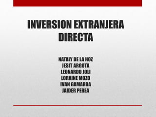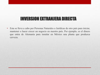 El documento resume los conceptos clave de la inversión extranjera directa. Explica que esta se produce cuando empresas o personas de otro país invierten en un negocio en el país anfitrión. Se divide en inversión única o mixta. Ofrece beneficios como la transferencia de tecnología, aumento de la productividad y empleo. Los inversionistas consideran factores como el riesgo país, capital humano e infraestructura.